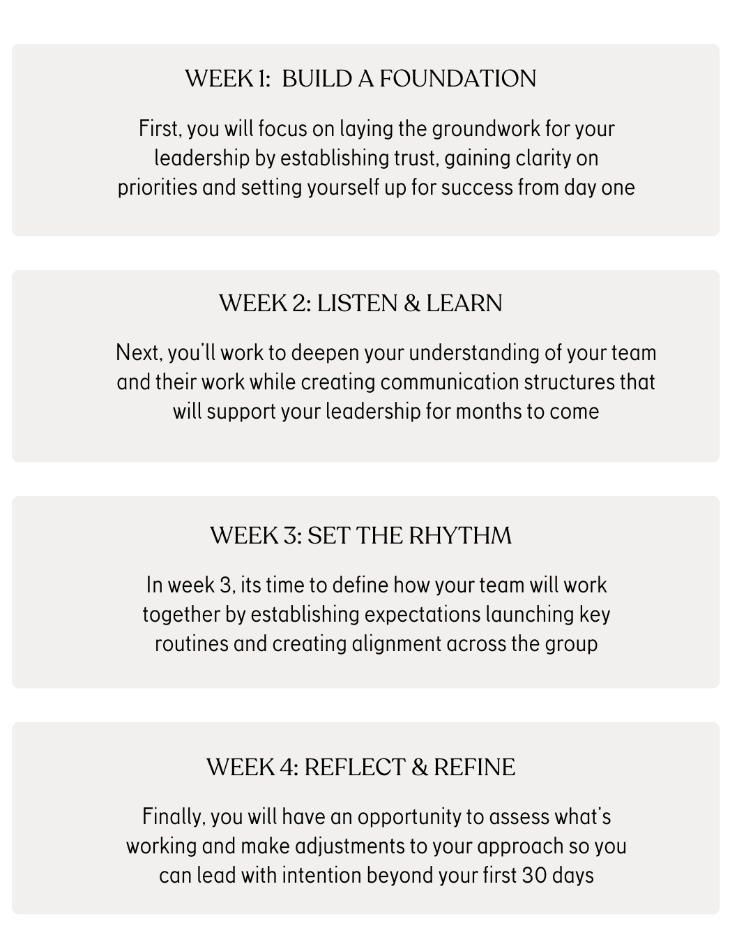 A practical, week-by-week guide that takes the guesswork out of your first 30 days as a manager. With this playbook, you'll know exactly what to focus on each week so you can lead with confidence and intention instead of constantly wondering if you're doing it right.